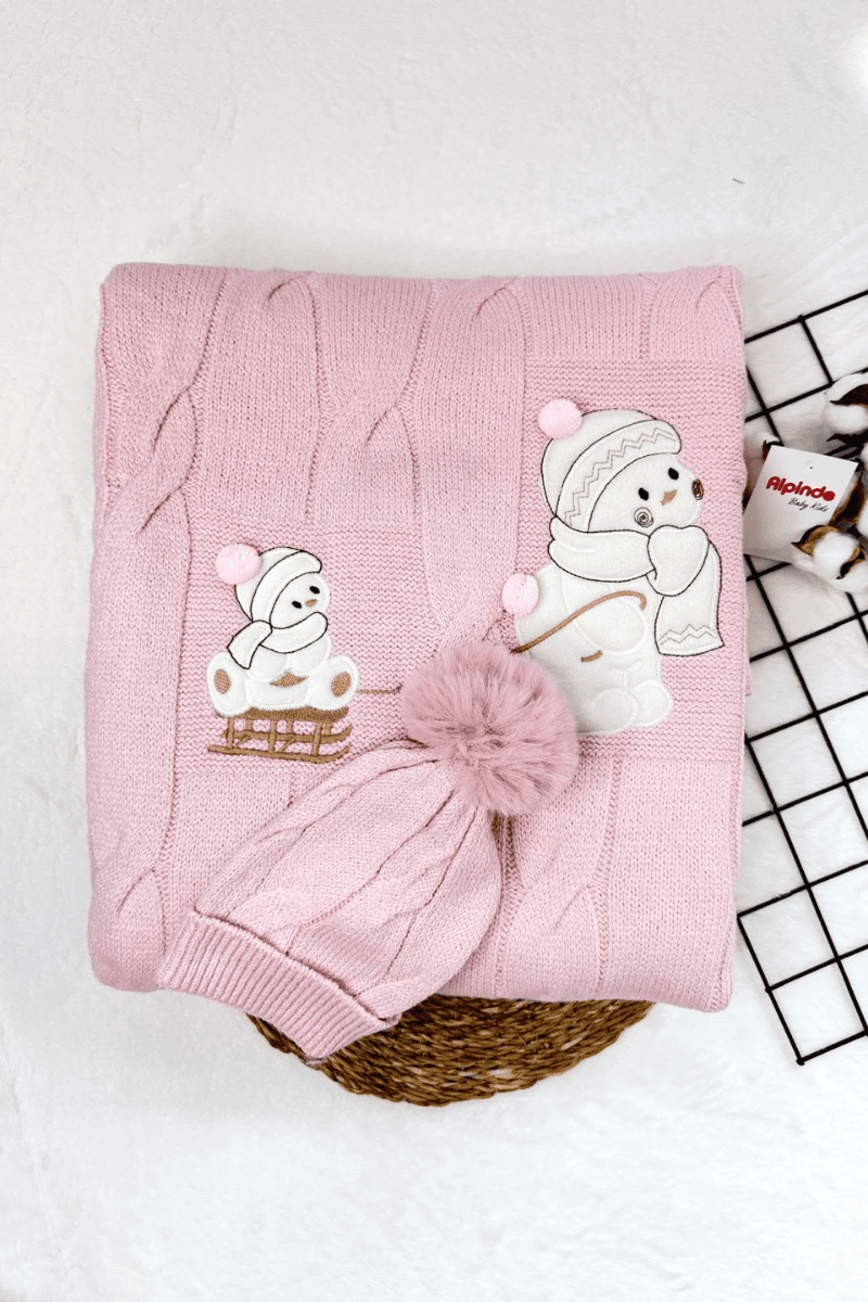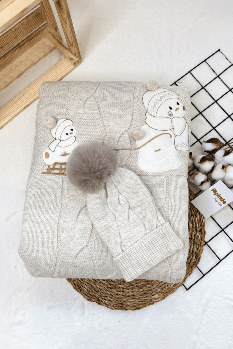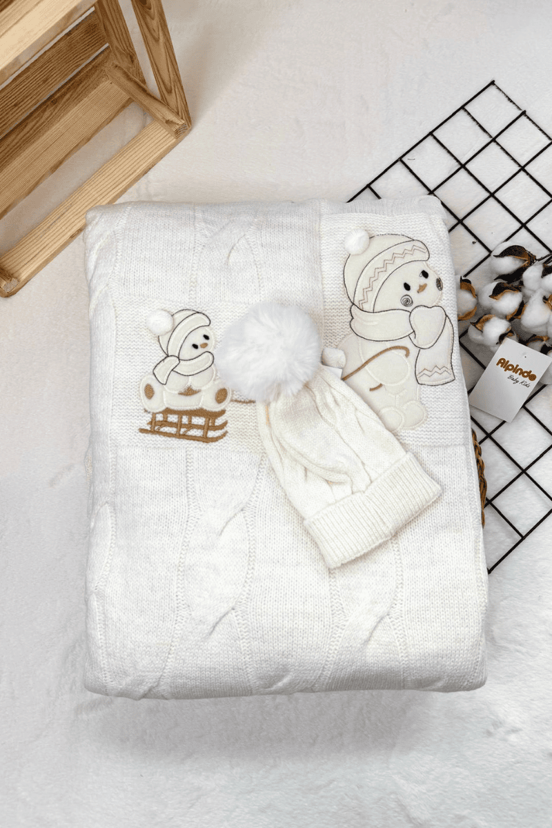 Ayı Desenli İçi Welsoftlu Triko Şapkalı Bebek Battaniyesi