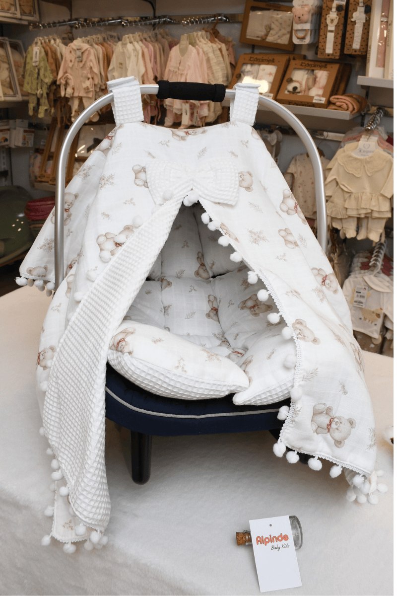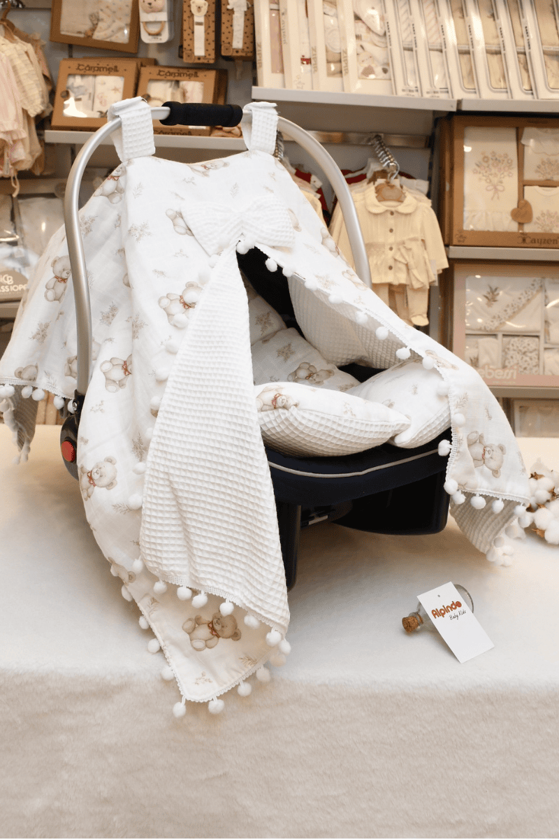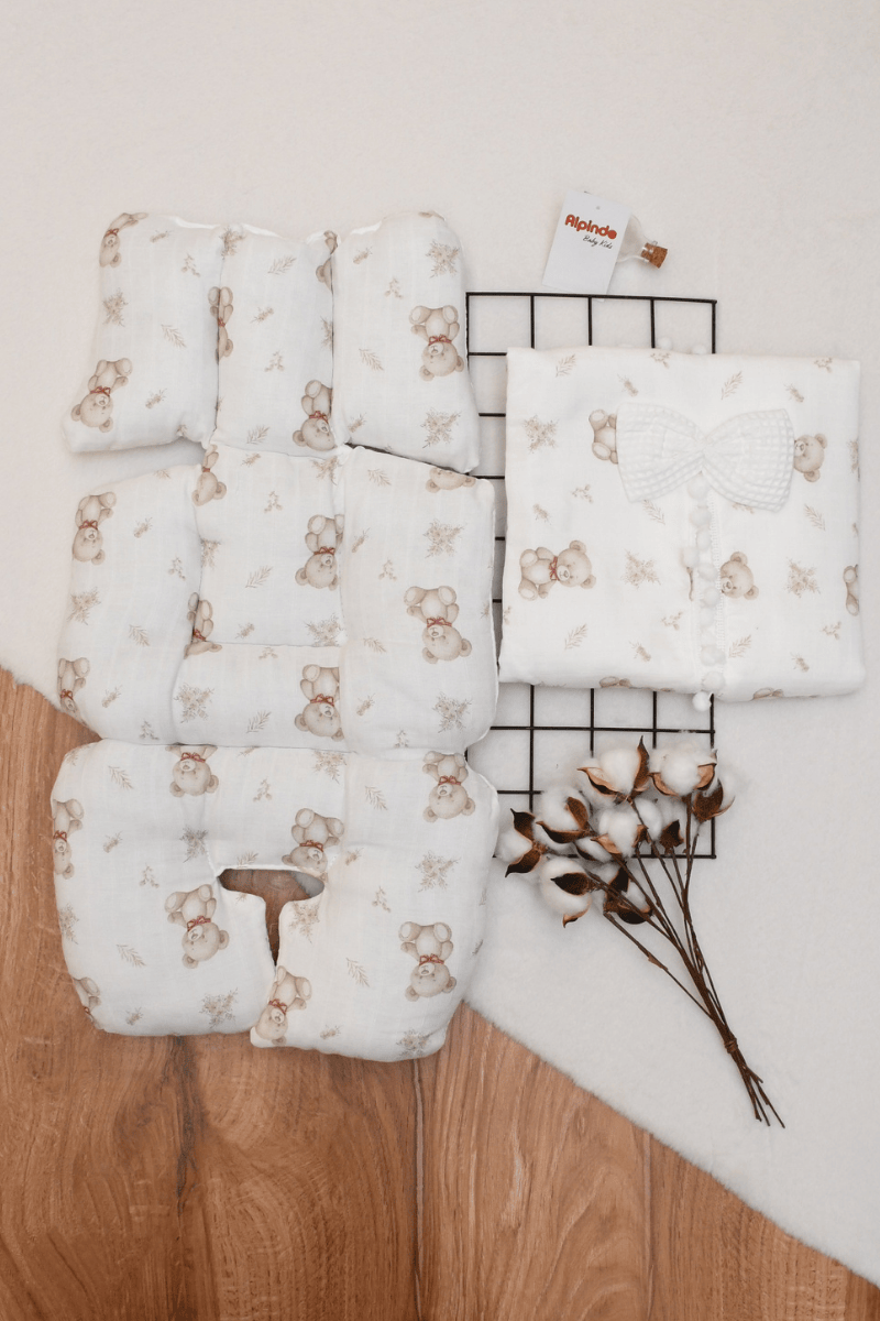 Ayıcık Baskılı Müslin Pike Puset Minderi ve Puset Örtüsü Set