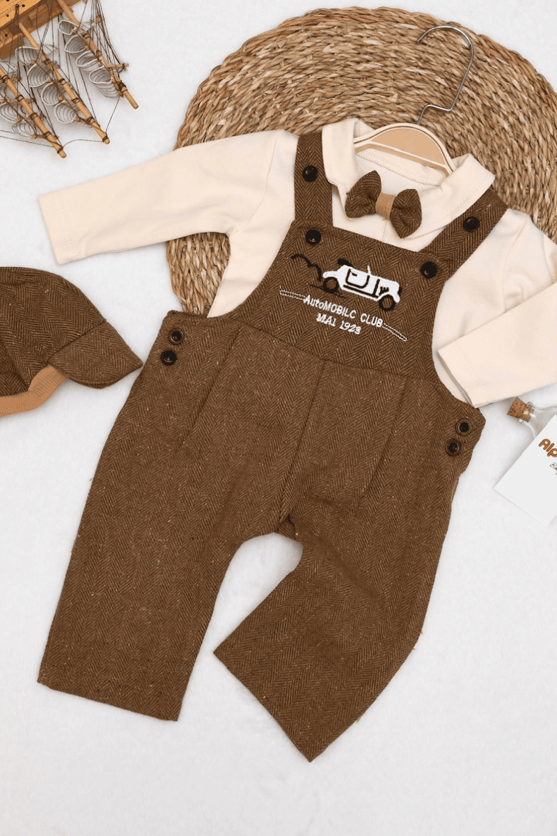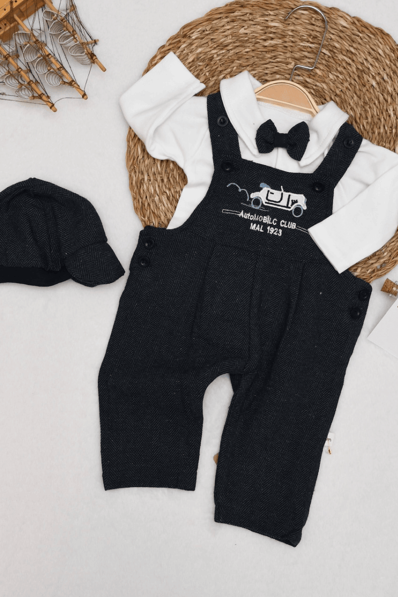 Balıksırtı Araba Armalı Şapkalı Papyonlu Erkek Bebek Salopet Tulum 0-3/3-6/6-9/9-12 Ay