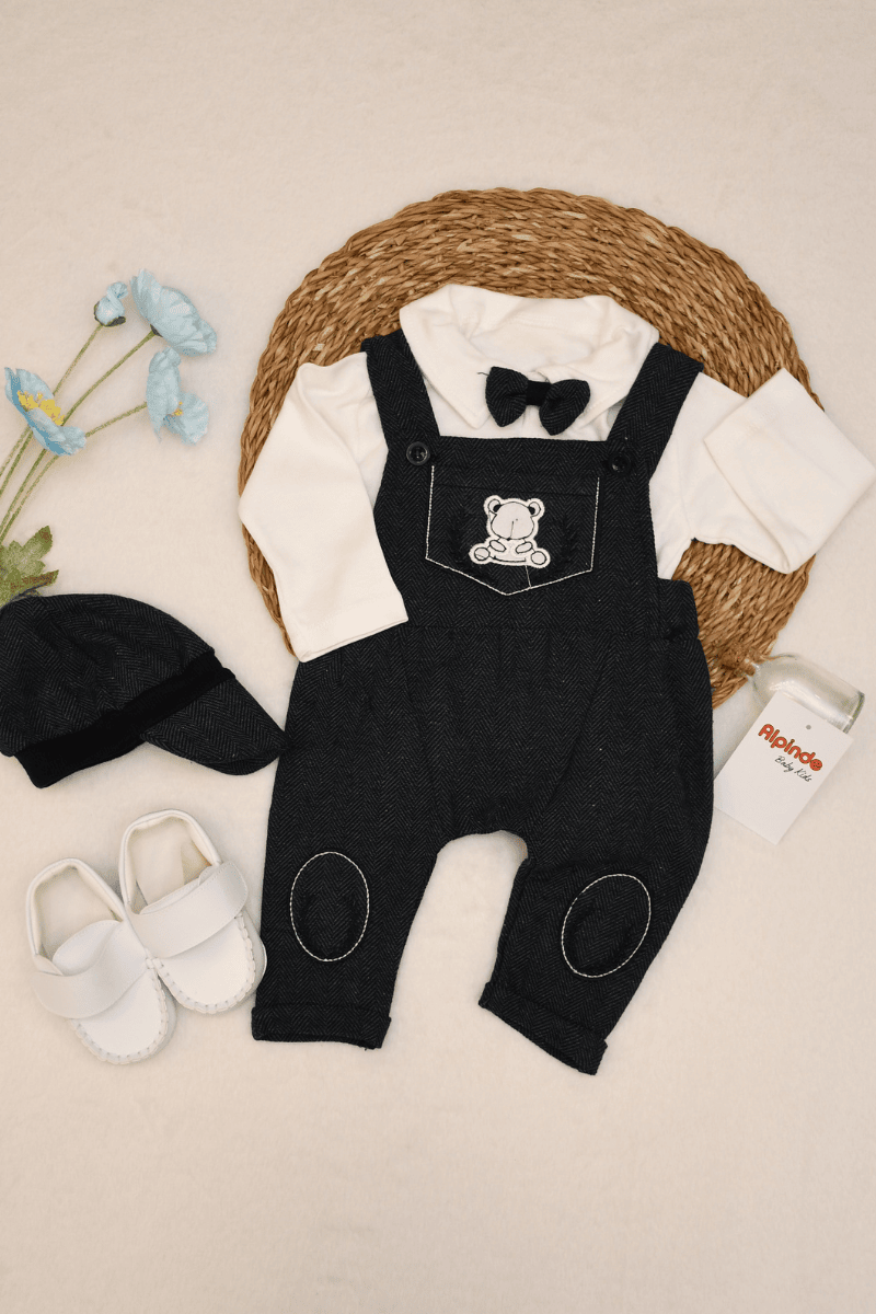 Balıksırtı Ayıcık Armalı Şapkalı Papyonlu Erkek Bebek Salopet Tulum 0-3/3-6/6-9/9-12 Ay