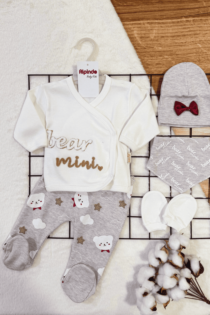 Bear Mini Punch Nakışlı %100 Pamuklu 5li Zıbın Set