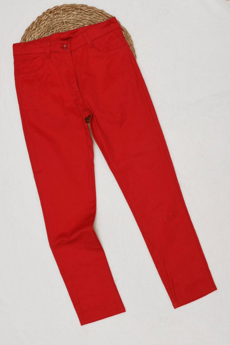 5/6/7/8 Yaş Bel Kısmı Düğmeli ve Fermuarlı Kapama Kırmızı Pamuklu Pantolon