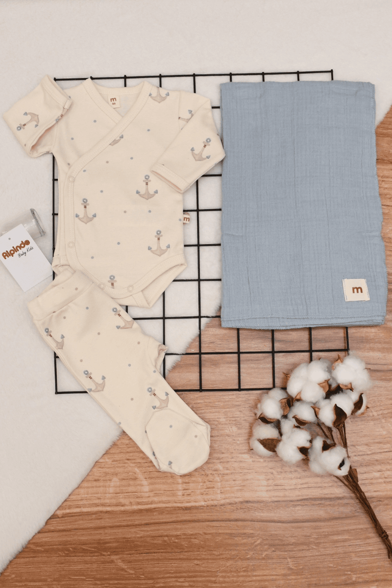 Çapa Baskılı Erkek Bebek Yenidoğan 3lü Hastane Çıkış Set 0-3 Ay Mavi