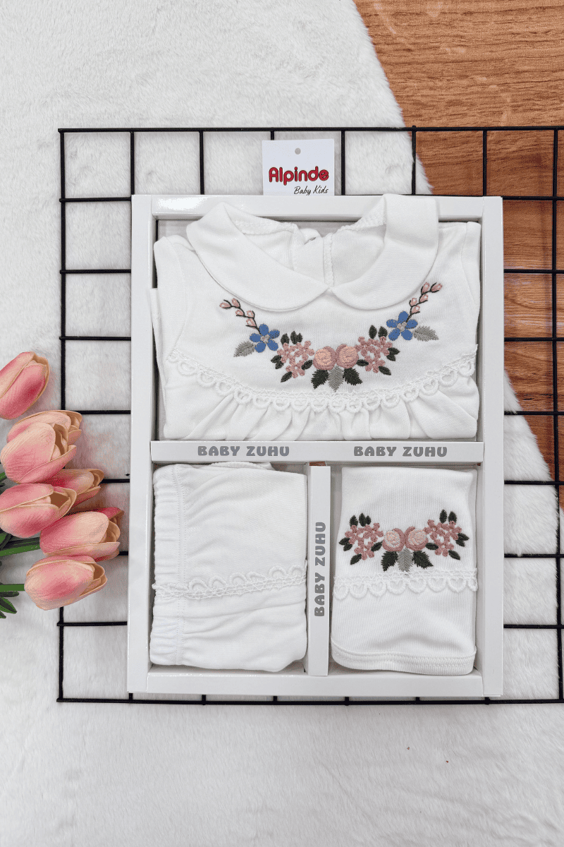 Çiçek Nakışlı %100 Pamuklu Yenidoğan Kız Bebek 5li Zıbın Set