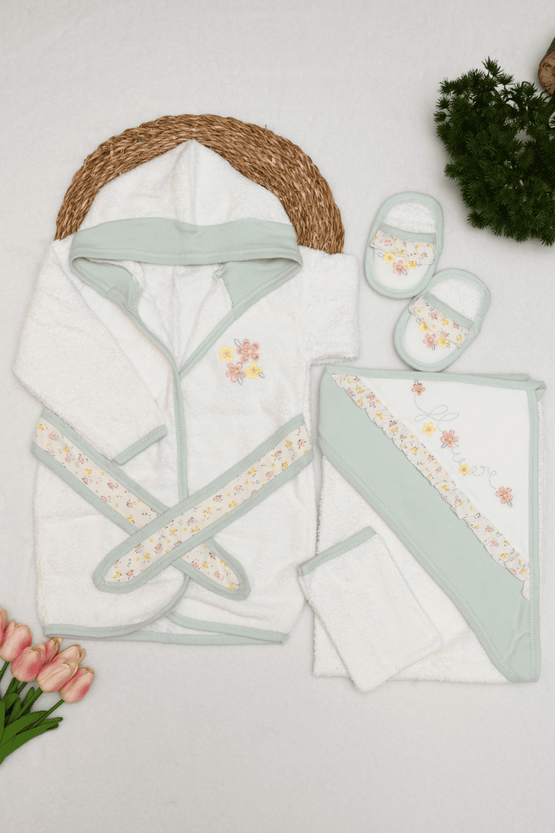 Çiçek Nakışlı Kundak Havlulu Bornoz Set 0-3 Yaş