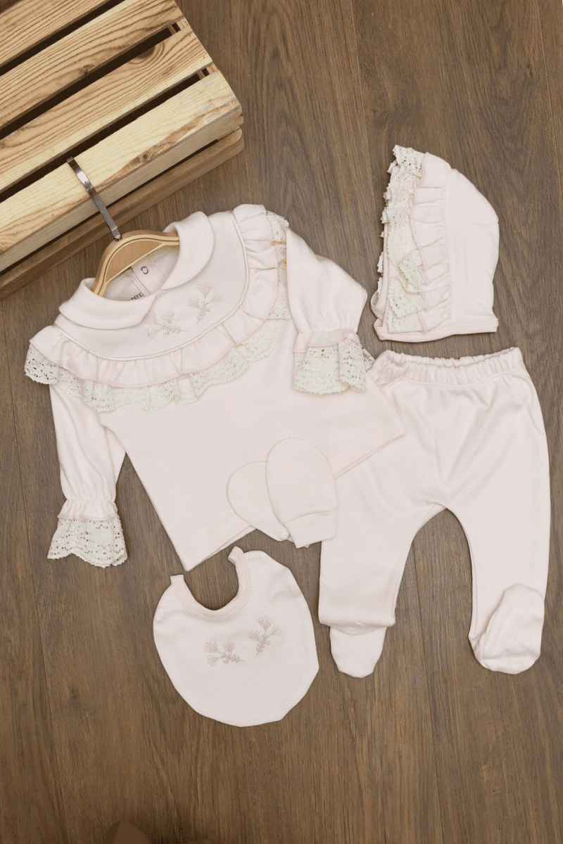 Çiçek Nakışlı Robası Dantelli %100 Pamuklu Kız Bebek Yenidoğan Hastane Çıkış Seti 0-3 Ay Pudra