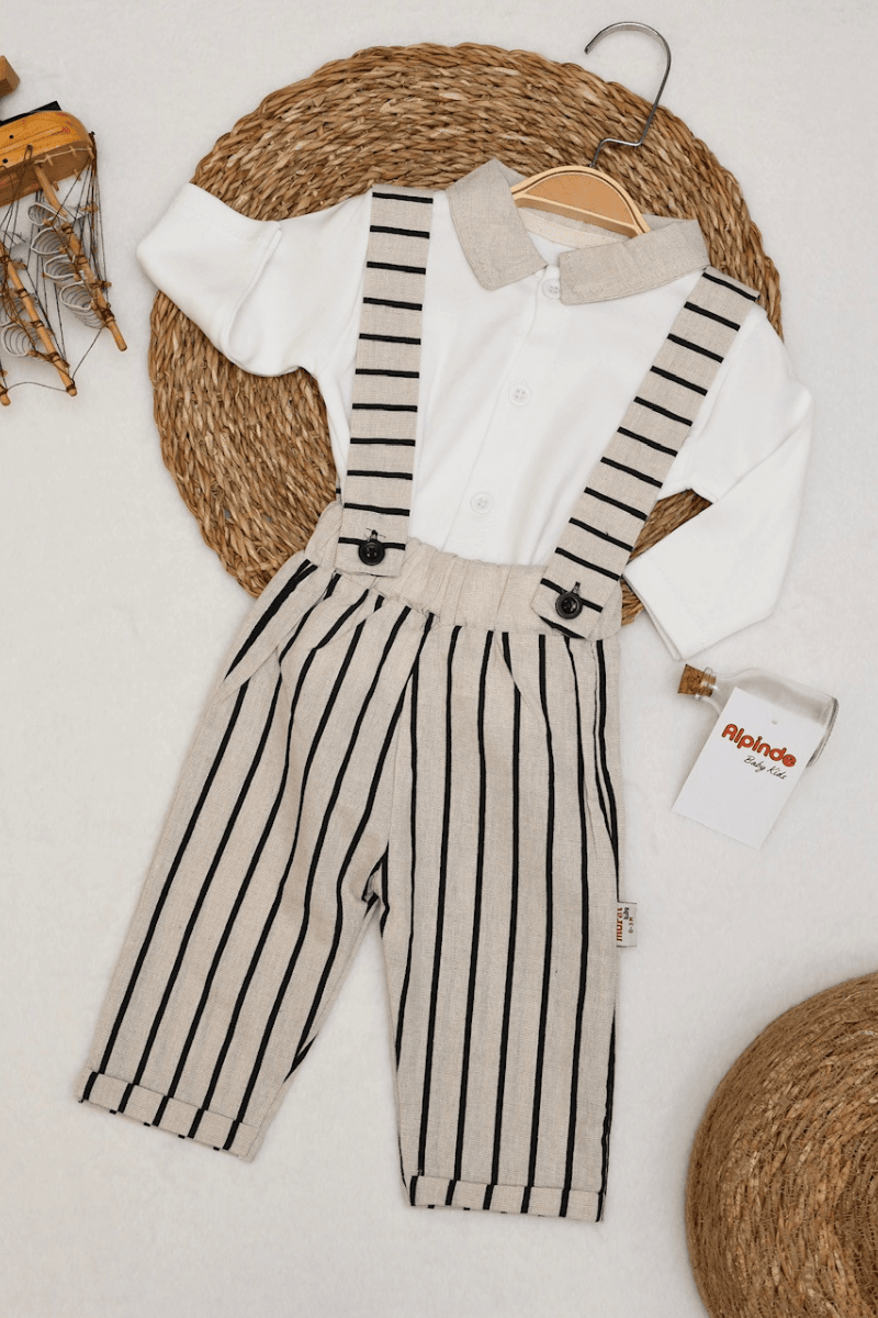 Dik Çizgili Askılı Salopet Gömlek Erkek Bebek Takım 0-3/3-6/6-9/9-12 Ay