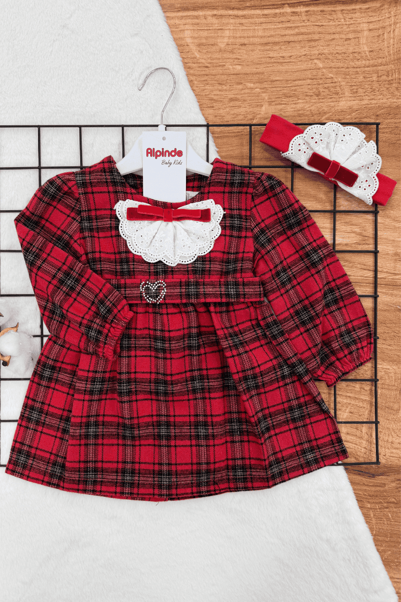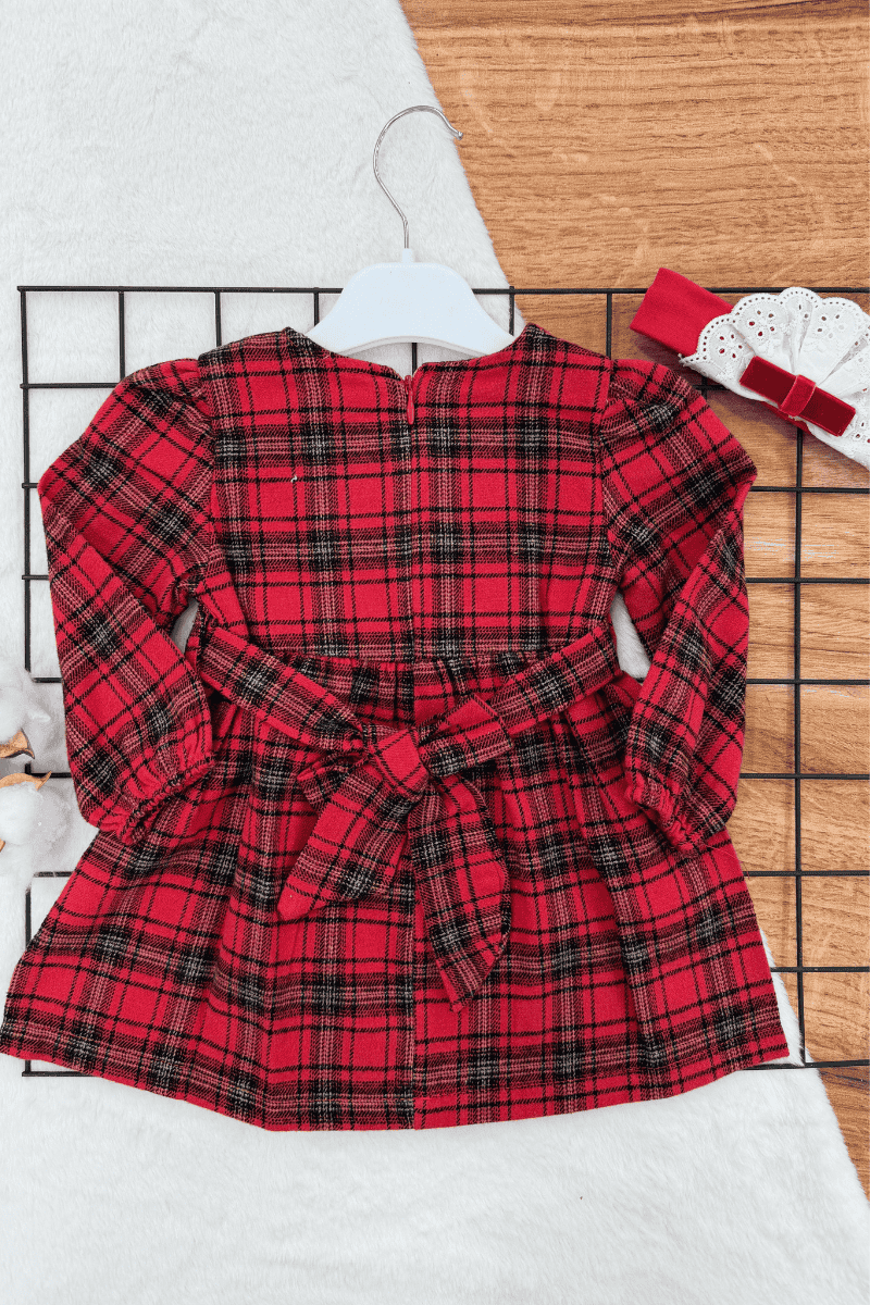 Kız Ekose Kemeri Taş Detaylı Kaşe Kumaş Elbise ( 9-24 )ay