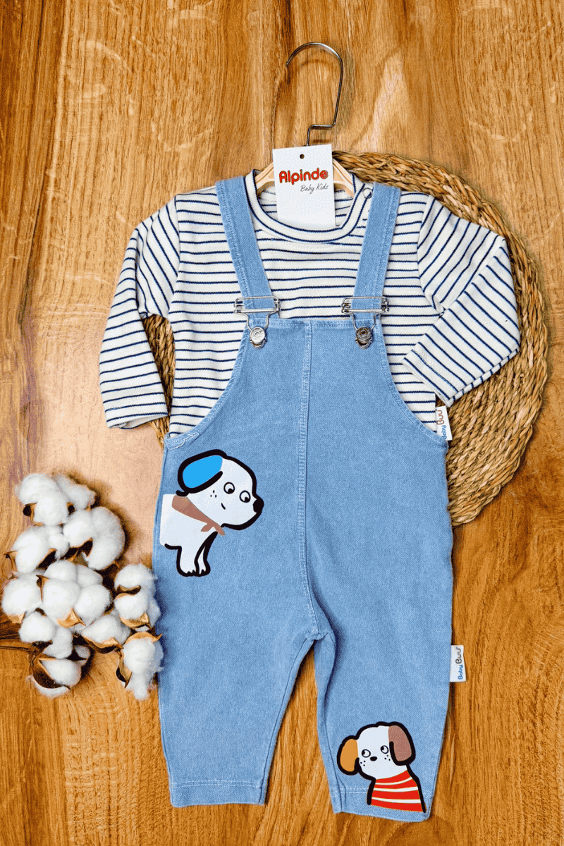 Köpek Baskılı Erkek Bebek Kot Salopetli Takım - Açık Mavi 6-9/9-12/12-18/18-24 Ay
