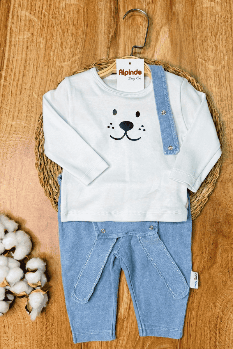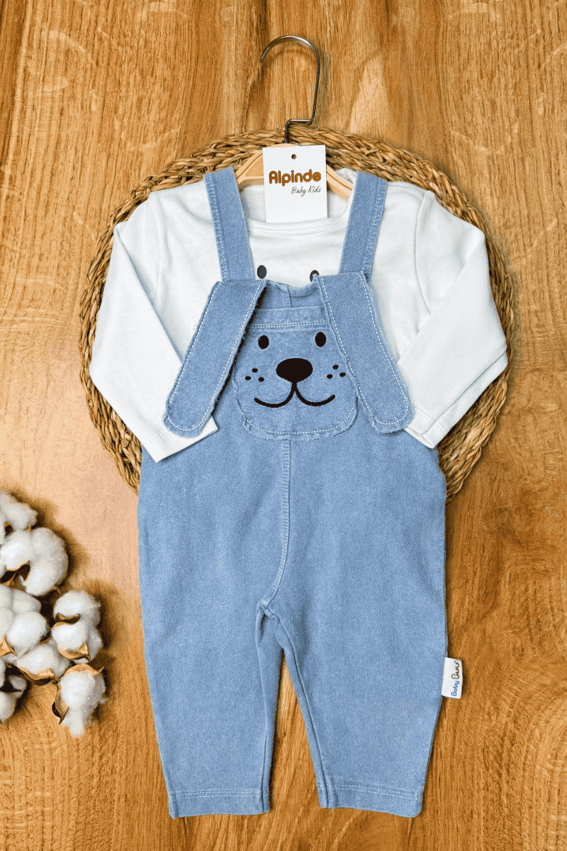 Köpek Desenli Erkek Bebek Kot Salopetli Takım - Açık Mavi 6-9/9-12/12-18/18-24 Ay