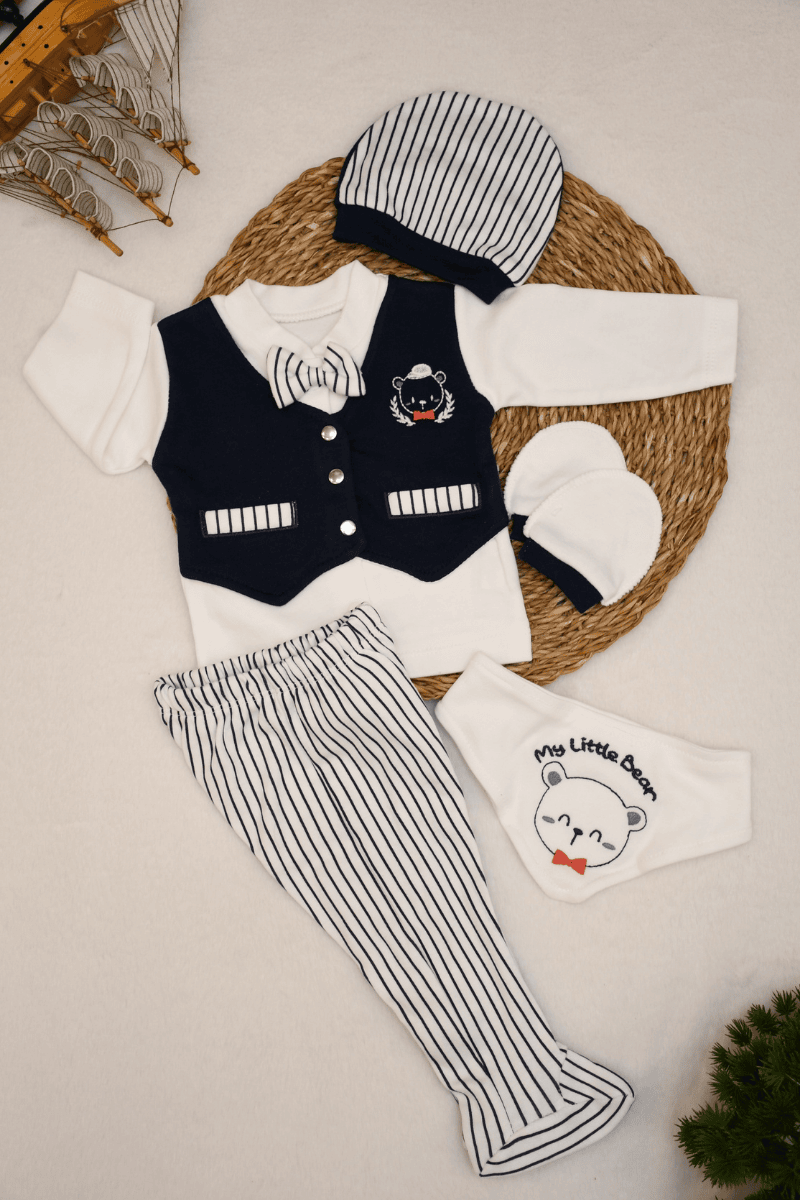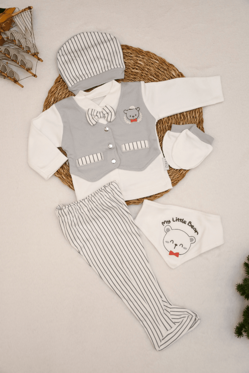 My Little Bear Nakışlı Yenidoğan % Pamuklu Erkek Bebek 5li Zıbın Set