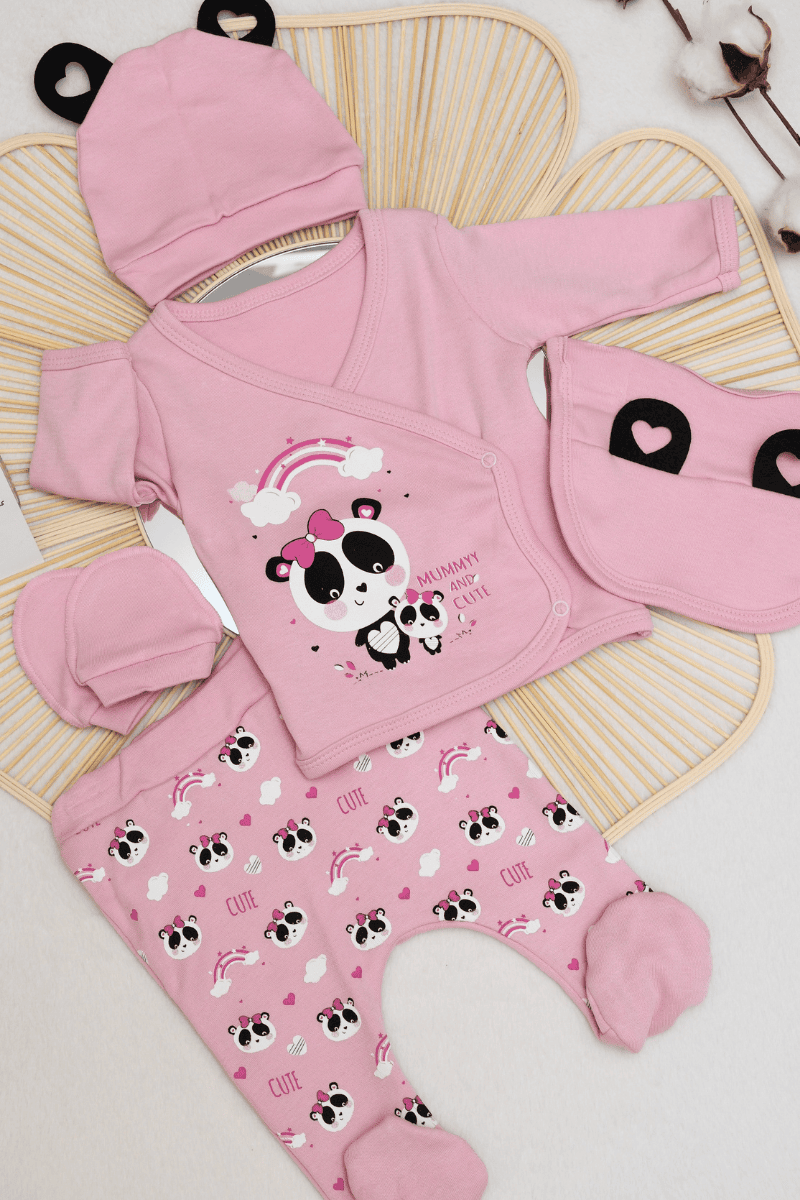 Panda Baskılı Yenidoğan Kız Bebek 5li Zıbın Set 0-3 Ay Pembe