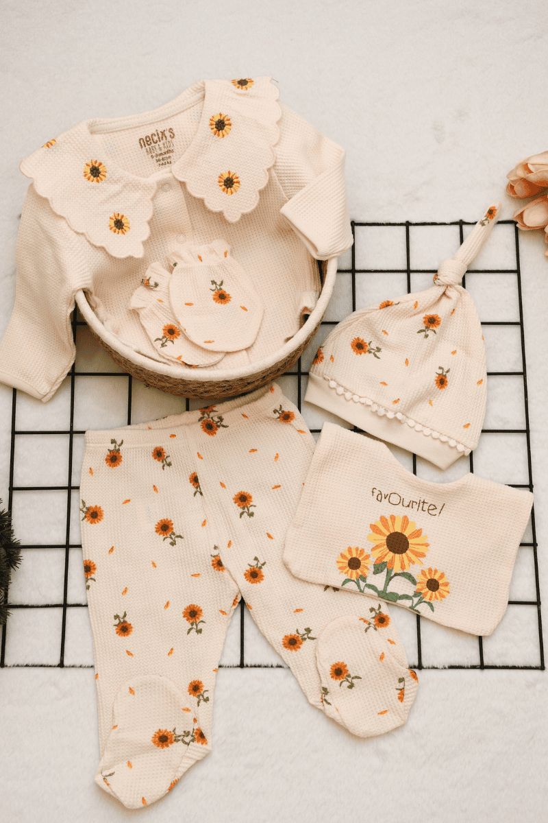 Papatya Desenli Waffle Kumaş %100 Pamuklu Yenidoğan Kız Bebek 5li Zıbın Set