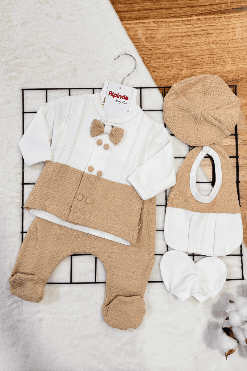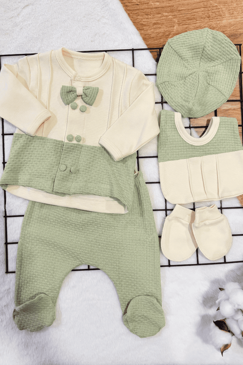 Papyonlu Çift Düğmeli Yenidoğan Erkek Bebek 5li Zıbın Set Hastane Çıkışı