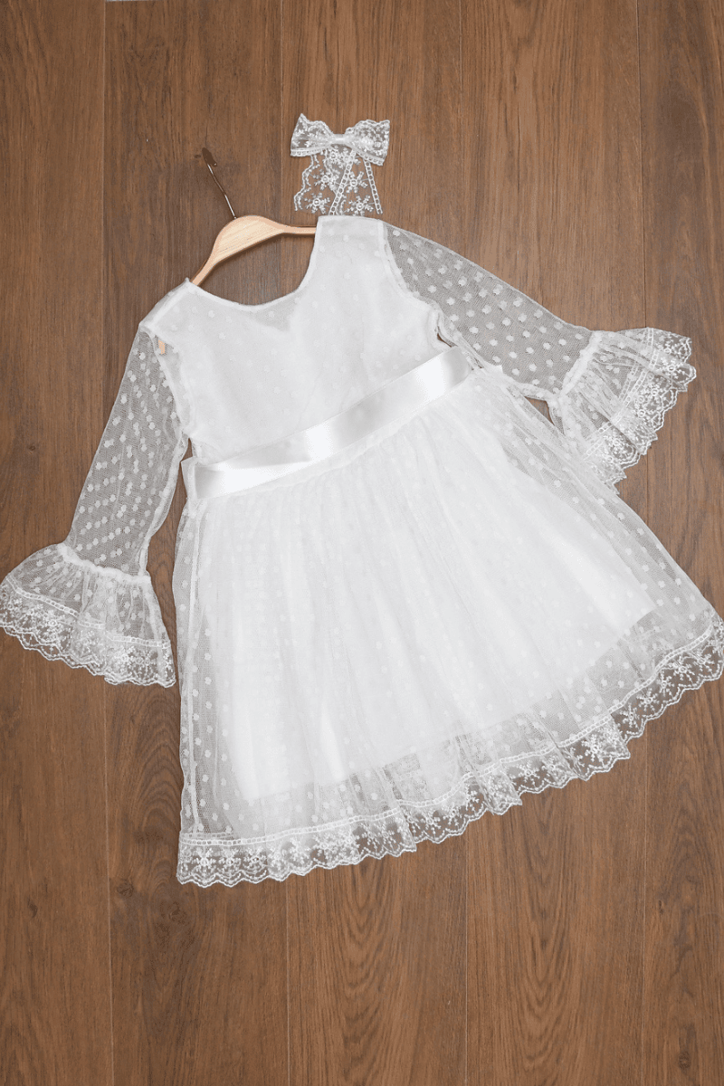 Prenses Model Puanlı Dantellii Tokalı Beyaz Renk Kız Çocuk Elbise 6/7/8/9 Yaş