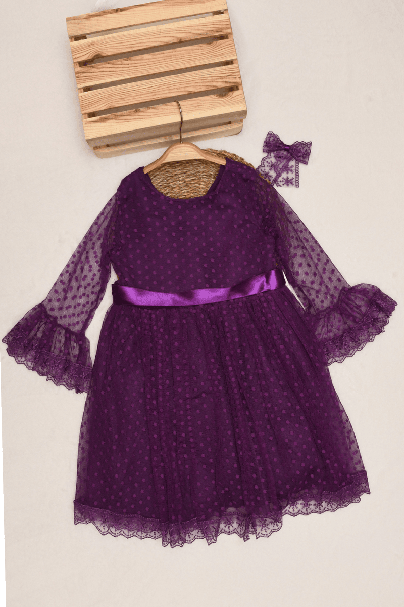 Prenses Model Puanlı Dantellii Tokalı Mor Renk Kız Çocuk Elbise 6/7/8/9 Yaş