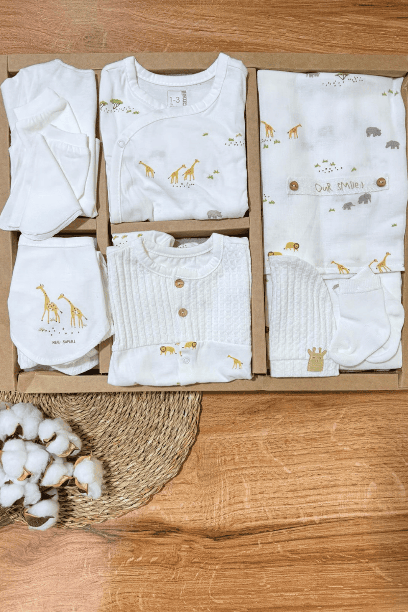 Safari Figürlü Tulumlu Yenidoğan Erkek Bebek Müslin Battaniyeli 10lu