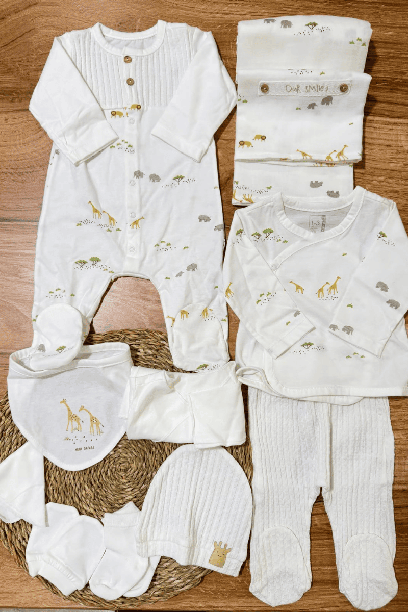 Safari Figürlü Tulumlu Yenidoğan Erkek Bebek Müslin Battaniyeli 10lu Zıbın Set Hastane Çıkışı