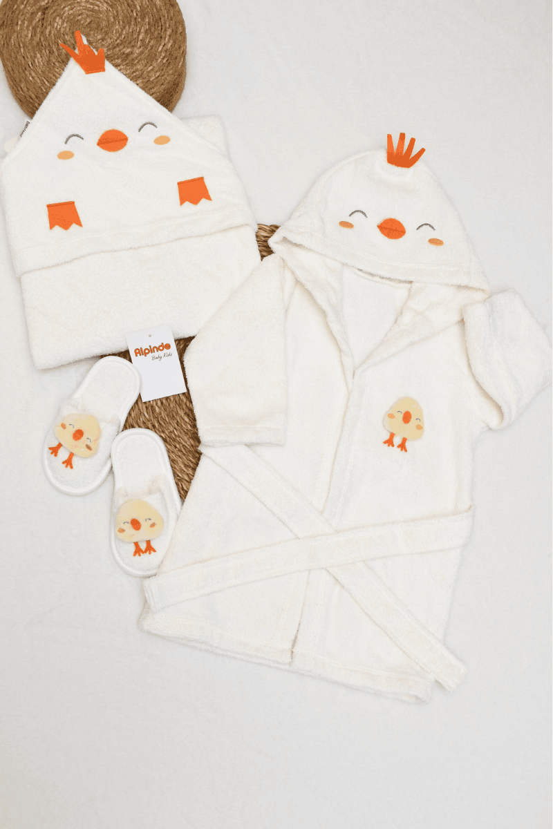 Sevimli Civciv Desenli %100 Pamuk Bebek Bornoz Seti 0-2 Yaş Kutulu