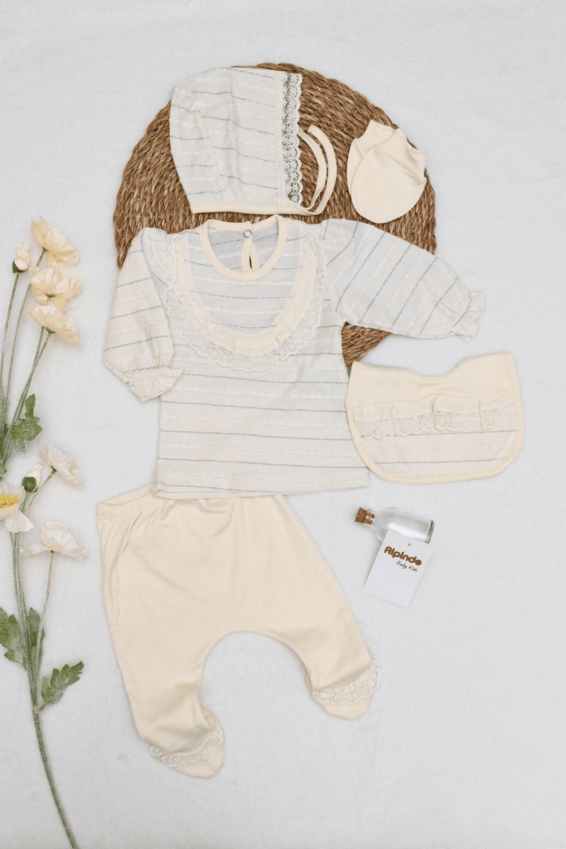 Sim Dantey Detaylı Yenidoğan Kız Bebek %100 Pamuk 5'li Zıbın Set 0-3 Ay