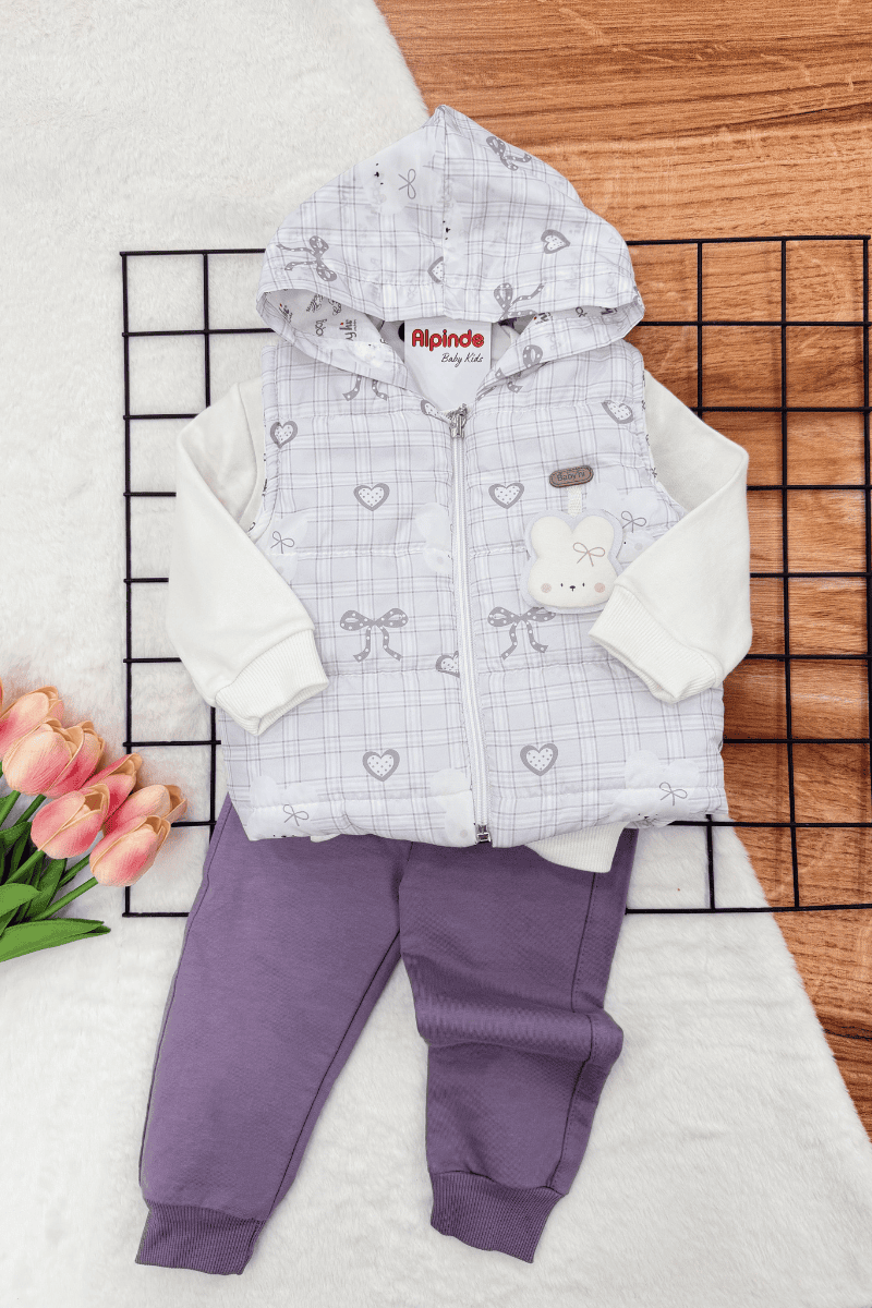 Tavşan Baskılı Yelekli Kız Bebek 3lü Takım (6-9-12 Ay)