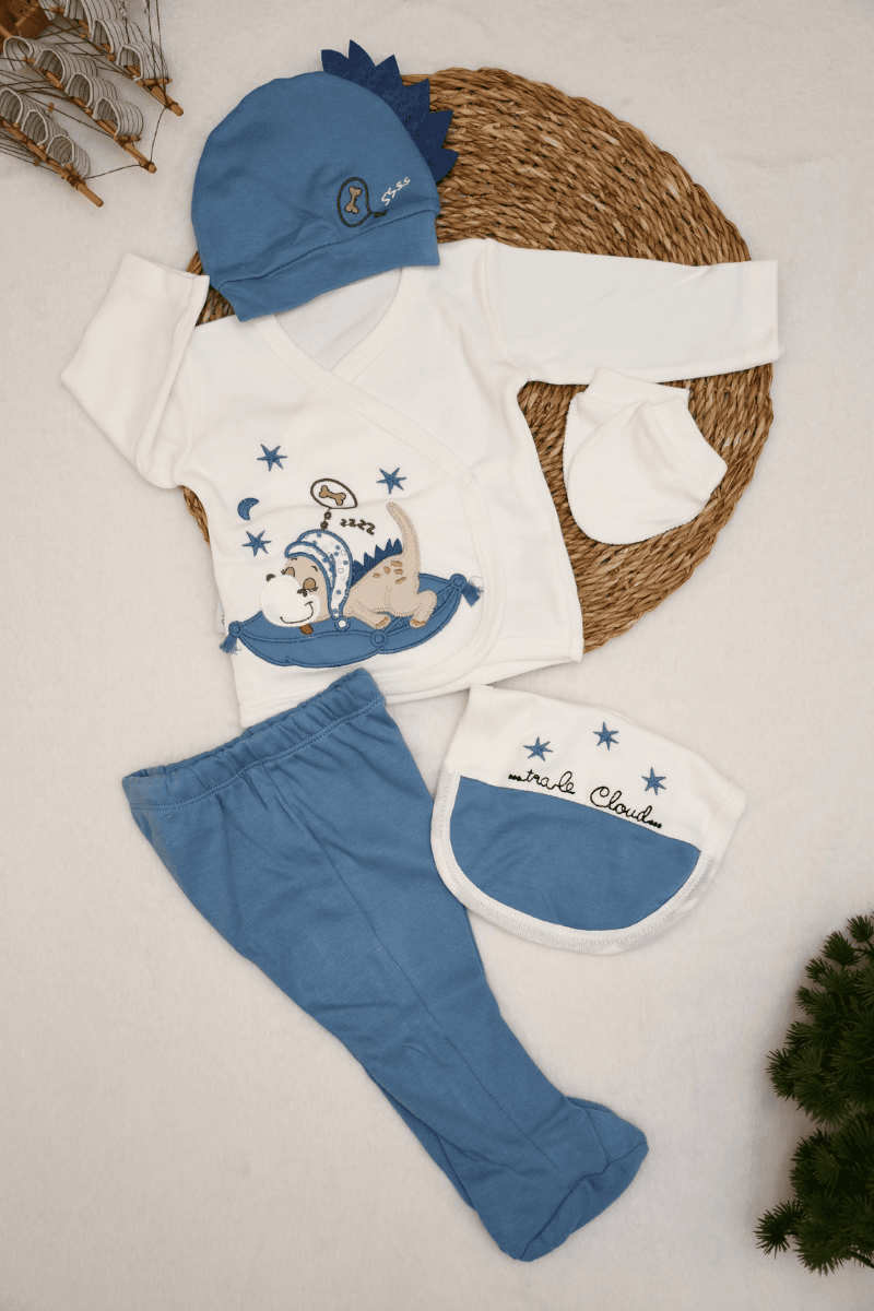 Uykucu Dinazor Nakışlı Yenidoğan Erkek Bebek 5li Zıbın Set